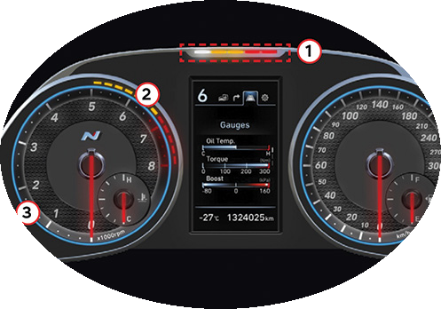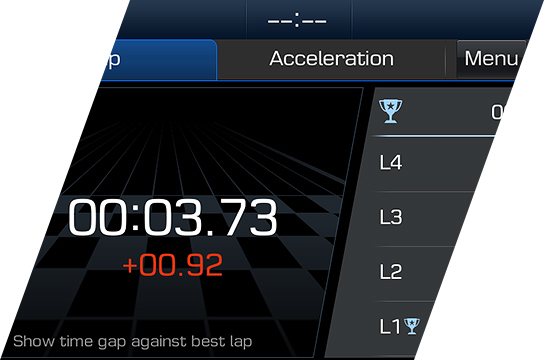 En la pantalla principal el conductor puede ver el contador de tiempo de vuelta, el indicador de fuerza G, la presión del Turbo y potencia de Torque. También pueden elegir entre cinco modos de manejo: Eco, Normal, Sport, N y N Custom, que a su vez pueden activarse usando los dos botones dedicados en el volante.